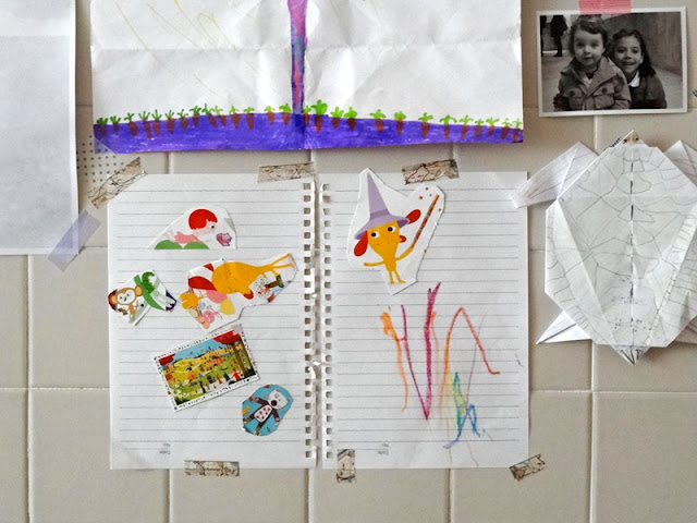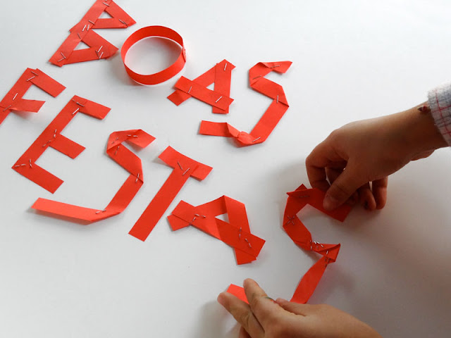 No meio das decorações surgiu o improviso. Aproveitei logo o potencial que estava a sair dali para mais umas palavrinhas ;-) . Adoro os "ós" e o modo como os colou. Não se rendeu quando lhe disse que o "ó" deveria ficar "espalmado" para facilitar a colagem (toma-lá-ó-mãe).