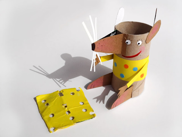 Dobrar um retângulo de cartão ao meio e cortar o formato do nariz do rato (a ponta do nariz fica na dobra), colar as duas extremidades no topo do rolo. Desenhar as patas, as orelhas, o rabo e os braços no cartão e recortar. Colar as orelhas de forma a que o rato esteja a olhar de lado para nós, a orelha de trás fica mais próxima do nariz e a outra com espaço suficiente para ainda fazer os dois olhos e a boca. Fazer dois cortes na base do rolo e um em cada pata para encaixarem um no outro, no interior do rolo dobrar o que sobra do cartão das patas e prender com fita cola.