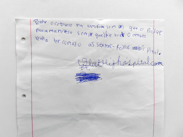 «Ponha o cotovelo na almofada sem ter que o pousar. Rode a manivela* sempre que lhe doer o ombro. Venha ter comigo às sextas-feiras ao hospital. beatrizhospital.com.pt»